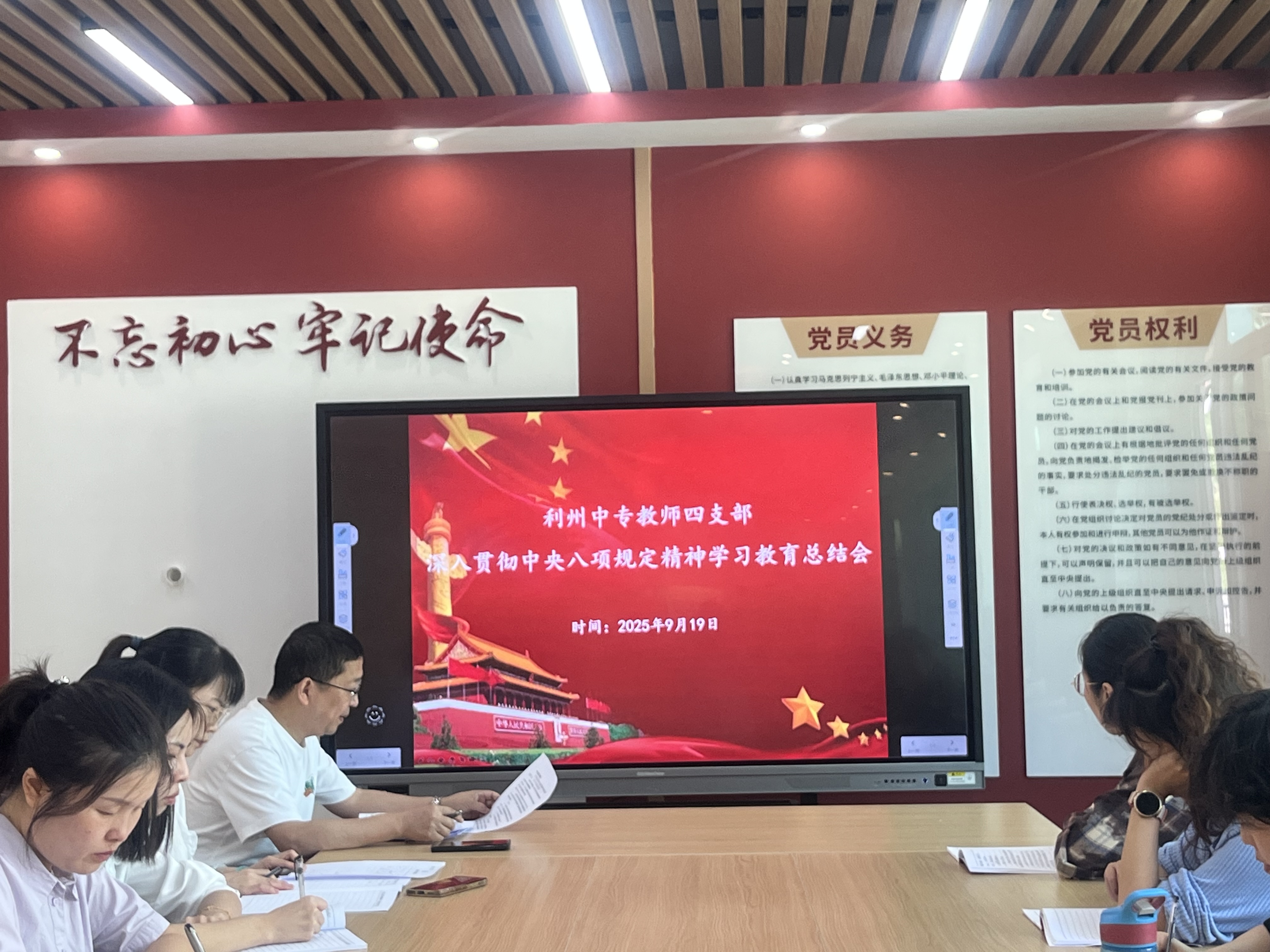 9月19日,利州中专教师第四支部组织召开党员大会,对开展深入贯彻中央八项规定精神学习教育活动进行总结。支部书记唐钧主持会议,支部全体党员参加。 会议首先传达学习了习近平总书记关于锲而不舍落实中央八项规定精神,推进作风建设常态化长效化的重要指示精神。全面总结了支部学习教育活动开展情况,就如何持续巩固拓展学习教育成果、锲而不舍落实中央八项规定精神、推进作风建设常态化长效化进行工作安排。会议要求,全体党员要持续深入学习贯彻习近平总书记重要讲话和指示精神,将其贯穿到工作、学习、生活的各个环节,坚持固本培元、增强党性,以优良的作风为为学校高质量发展提供坚实保障。 随后,会议集中传达学习了省委十二届七次全会和市委八届十一次全会精神,结合广元市建设国际旅游城市的战略部署,指出职业教育应主动融入地方发展大局,助力文旅融合和产业升级。党员教师要深刻认识省委建设文化强省、旅游强省的目标部署和市委“1345”发展战略,锚定发展目标,强化示范引领,增强践行“两个维护”的政治自觉。将全会精神融入课堂教学和科研实践,培养学生服务地方经济社会发展的意识和能力。 会议还组织全体党员集中学习了《中国共产党党员网络行为规定》及《网络行为“十不准”》等文件,进一步教育引导党员严守党的纪律,自觉维护党中央权威,保持党员干部良好形象,规范网络行为,传播正能量,共同营造健康、积极、和谐的网络环境。