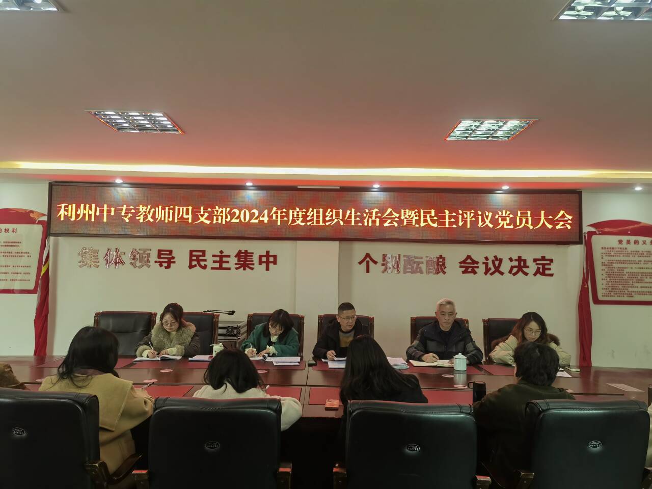 为巩固深化党纪学习教育成果,根据学校部署要求,3月19日下午,利州中专教师一支部在修德楼东3-4办公室召开2024年度组织生活会暨民主评议党员大会。学校党委委员、副校长郑敏出席会议,支部全体党员参会,会议由支部书记赵星圻主持。 会前,教师一支部支委对开好此次民主生活会高度重视,认真组织党员开展学习研讨,多方征求意见建议,深入开展谈心谈话,认真撰写对照检查材料,为开好此次会议做好了充分的准备。 会上,支部书记赵星圻代表支委作对照检查,并带头进行个人对照检查,其他支委和党员同志依次作个人对照检查。大家紧扣党纪学习教育目标和任务,对照严守政治纪律、增强党性作风、勇于担责创新、全面从严治党四个方面查摆突出问题,严肃开展批评与自我批评。会议还以无记名投票方式,对每名党员进行民主测评,并向本人进行反馈。 党委委员、副校长郑敏对本次组织生活会给予了充分肯定,称赞前期筹备工作扎实细致,自我剖析深刻入微,相互批评切中要害且富有成效。同时,郑敏同志结合教师一支部的工作实际,就下一步工作提出三点要求:一是提高政治站位,强化理论学习。将党的政策理论、习近平总书记的重要讲话精神以及前沿教育理念深融入日常教学实践,强化“党建+业务”融合新模式,持续加强“党建+教学提质工程”党建品牌创建;二是加大宣传力度,深挖特色亮点。借助校园官网、公众号等多元平台,广泛宣传教育教学改革、党员教师先进事迹等方面的典型案例,全力塑造良好的支部形象,切实发挥示范引领效应;三是打破固有壁垒,创新协作机制。鼓励党员教师跨越学科、年级界限,通过师徒结对、教学研讨沙龙等多样化活动,促进教师间的经验分享与互助成长,凝聚支部力量,助力学校整体教育教学水平实现跨越式提升。