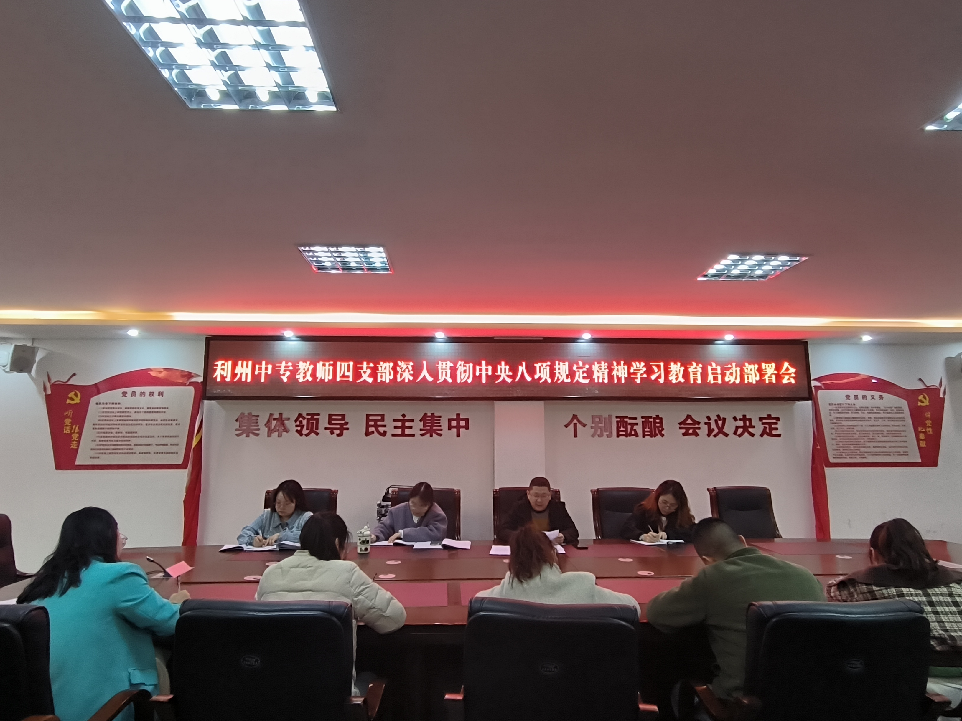 2025年3月28日,利州中专业教师四支部在行政楼会议室召开深入贯彻中央八项规定精神学习教育启动部署会议。会议由支部书记主持,支部全体党员参加会议。 会议传达学习了中央党的建设工作领导小组会议精神、中共中央办公厅《关于在全党开展深入贯彻中央八项规定精神学习教育的通知》精神和学校党委深入贯彻中央八项规定精神学习教育启动部署会议精神,宣读了学校党委《关于在利州中专开展深入贯彻中央八项规定精神学习教育的实施方案》。 会议指出,支部将把开展深入贯彻中央八项规定精神学习教育同巩固深化主题教育和党纪学习教育成果相结合,同深入推进党风廉政建设和反腐败斗争相结合,从抓实学习研讨、抓实问题查摆、抓严集中整治、抓好开门教育四个方面扎实开展此次学习教育活动,引导全体党员切实改进工作作风、密切联系群众。 会议要求,全体党员要提高政治站位,深刻领会开展此次学习教育的重要意义,要切实把思想和行动统一到党中央决策部署以及学校党委工作要求上来。要坚持问题导向,全面深入查找自身在贯彻中央八项规定精神方面存在的问题,以更高的标准、更严的要求规范自身行为。要将学习教育与日常教学、管理工作紧密结合,做到学思用贯通、知信行统一,确保学习教育取得实实在在的成效,以良好的作风推动学校教育事业高质量发展。 此次启动部署会议的召开,标志着教师四支部深入贯彻中央八项规定精神学习教育正式拉开帷幕。在未来的工作中,教师四支部全体党员将以此次学习教育为契机,不断加强自身作风建设,以更加饱满的热情、更加扎实的工作,为利州中专的发展贡献力量,为培养德智体美劳全面发展的社会主义建设者和接班人而努力奋斗。