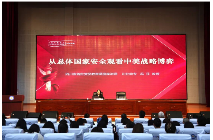 冯莎教授以《从总体国家安全观看中美战略博弈》为题,通过“中美博弈”视角,带来了一场高屋建瓴、思想深邃的专题讲座。讲座中,冯莎教授从“认识总体国家安全观的全局视野、当前美国对我遏制打压全面升级和下一阶段的中美关系走势及应对”三个方面,深入解读国内外发展大势,同时结合中职教育实际,点拨思政育人实践方法,为在场教职工带来了一次开阔视野的“充电”与赋能教学的“加油”。